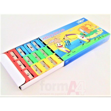 CAJA 24 AFILALAPICES PLASTICO COLORES SURT. MTL Afilalápices de plástico resistente con forma rectangular y con cuchilla de acero.